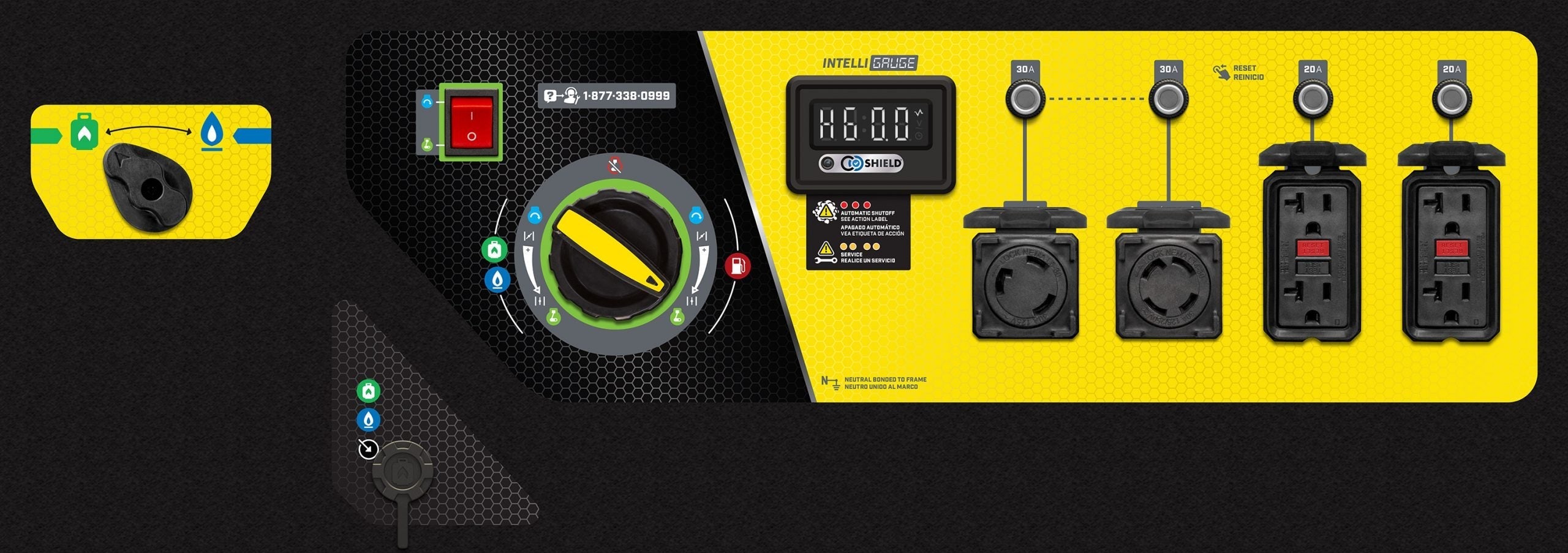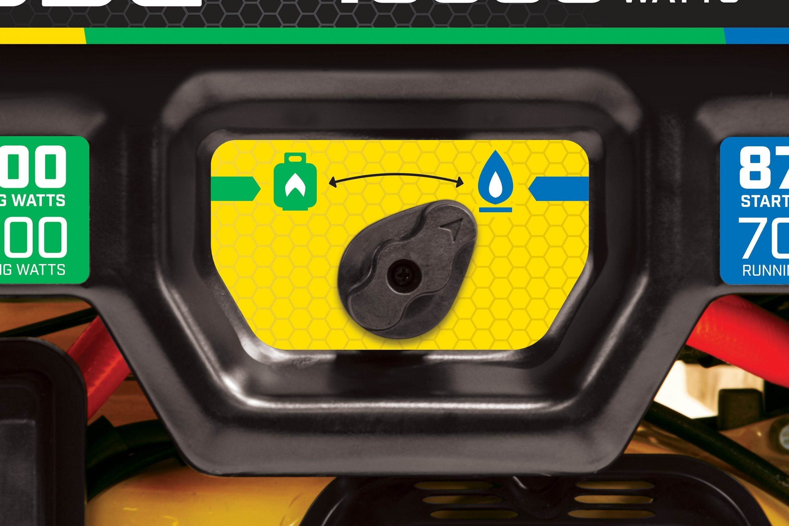 The EZ Start dial allows you to safely select gasoline, propane (LPG), or natural gas (NG) as your fuel source, plus a propane/natural gas selector is located on the side panel.