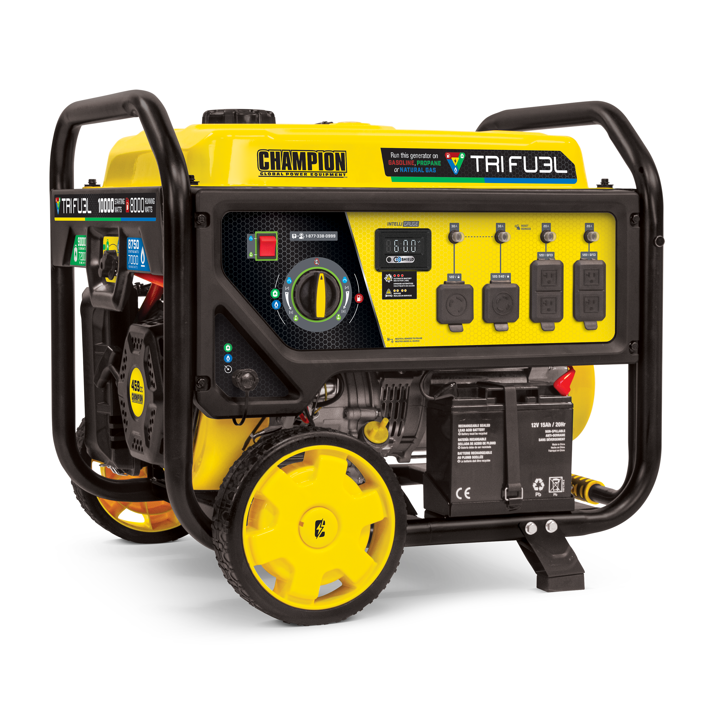 Using gasoline, the 459cc Champion engine produces 10,000 starting watts and 8000 running watts, and will run for 12.5 hours at 50% load when the 8.5-gallon fuel tank is full. When using a 20-pound propane tank, it produces 9000 starting watts and 7200 running watts, and will run for 5 hours at 50% load.