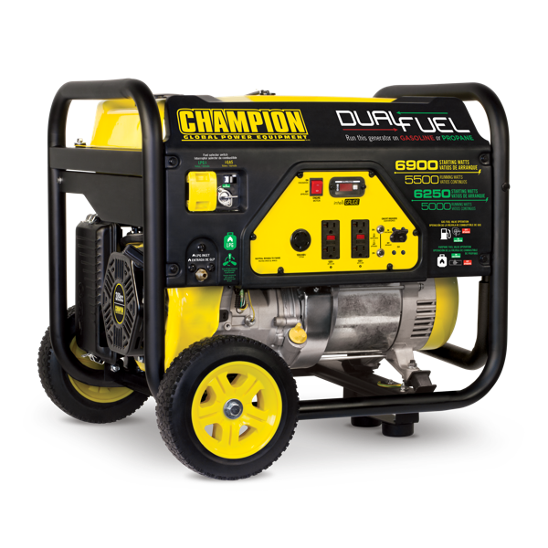 The Champion Power Equipment 100231 5500-Watt Dual Fuel Portable Generator with Wheel Kit is designed with versatility and convenience in mind. An ideal companion for your next weekend project or wherever you might need additional power, this generator can also provide plenty of backup power for your home during an outage. Operate your Dual-Fuel generator right out of the box on gasoline or propane, and easily switch fuels with our patented fuel selector switch that allows for safe switching between fuel sources. Using gasoline, the 389cc Champion engine products 6900 starting Watt and 5500 running Watt, and will run for 9 hours at 50% load when the 6.0 Gal. fuel tank is full. When using a 20-pound propane tank, it produces 6250 starting watts and 5000 running Watt, and will run for 6.5 hours at 50% load. With a noise level of 74 dBA from 23 feet, which is a bit louder than a vacuum, this machine features Cold Start Technology to ensure a quick start in cold weather. The Volt Guard built-in surge protector prevents overloads and keeps your equipment safe from spikes in voltage, while the Intelligauge monitors voltage, frequency and operating hours. The foldaway U-shaped handle and included wheel kit with never flat tires make it a cinch to move your power where you need it. EPA certified and CARB compliant. Champion Support and our nationwide network of service centers will back your purchase up with a 3-year limited warranty and free lifetime technical support.