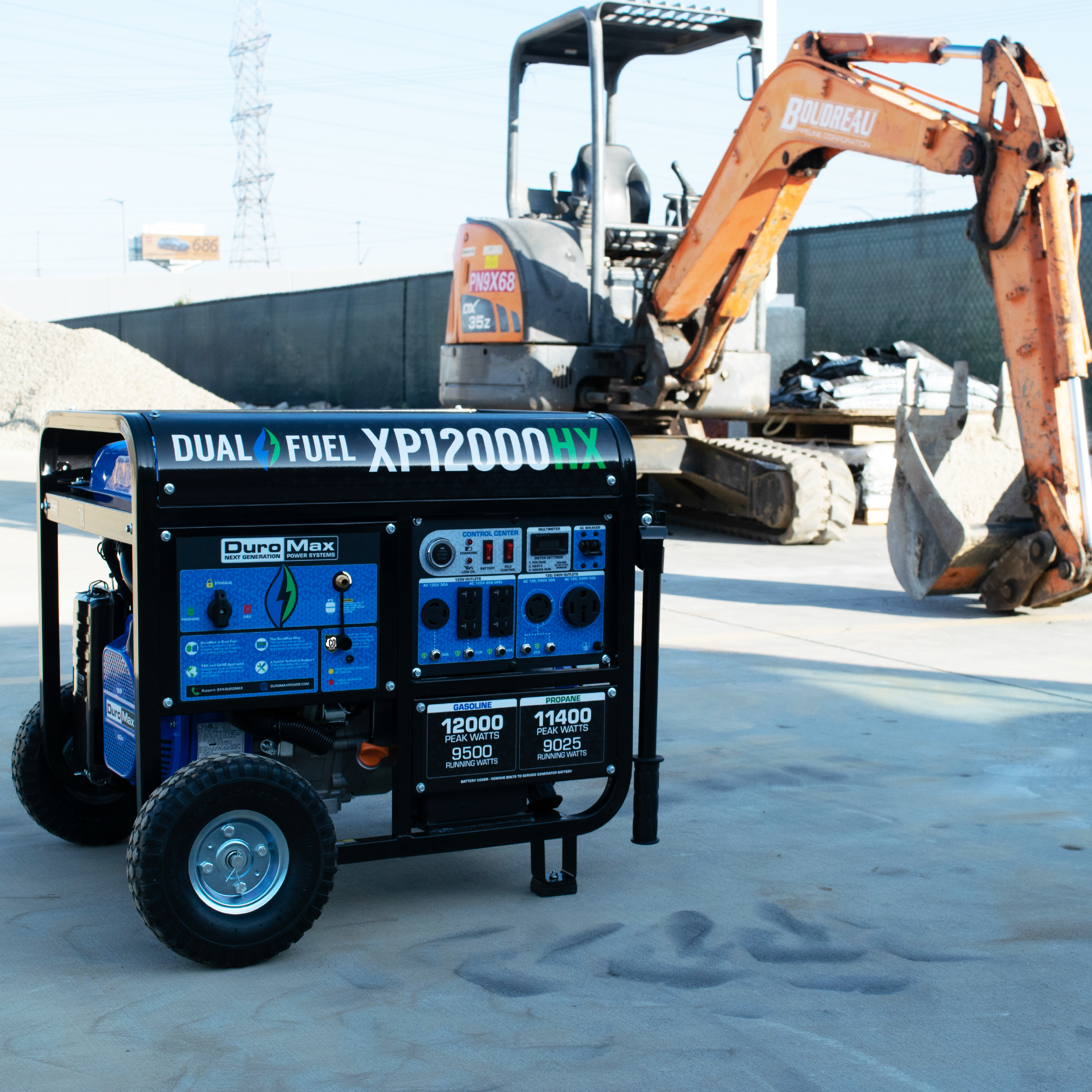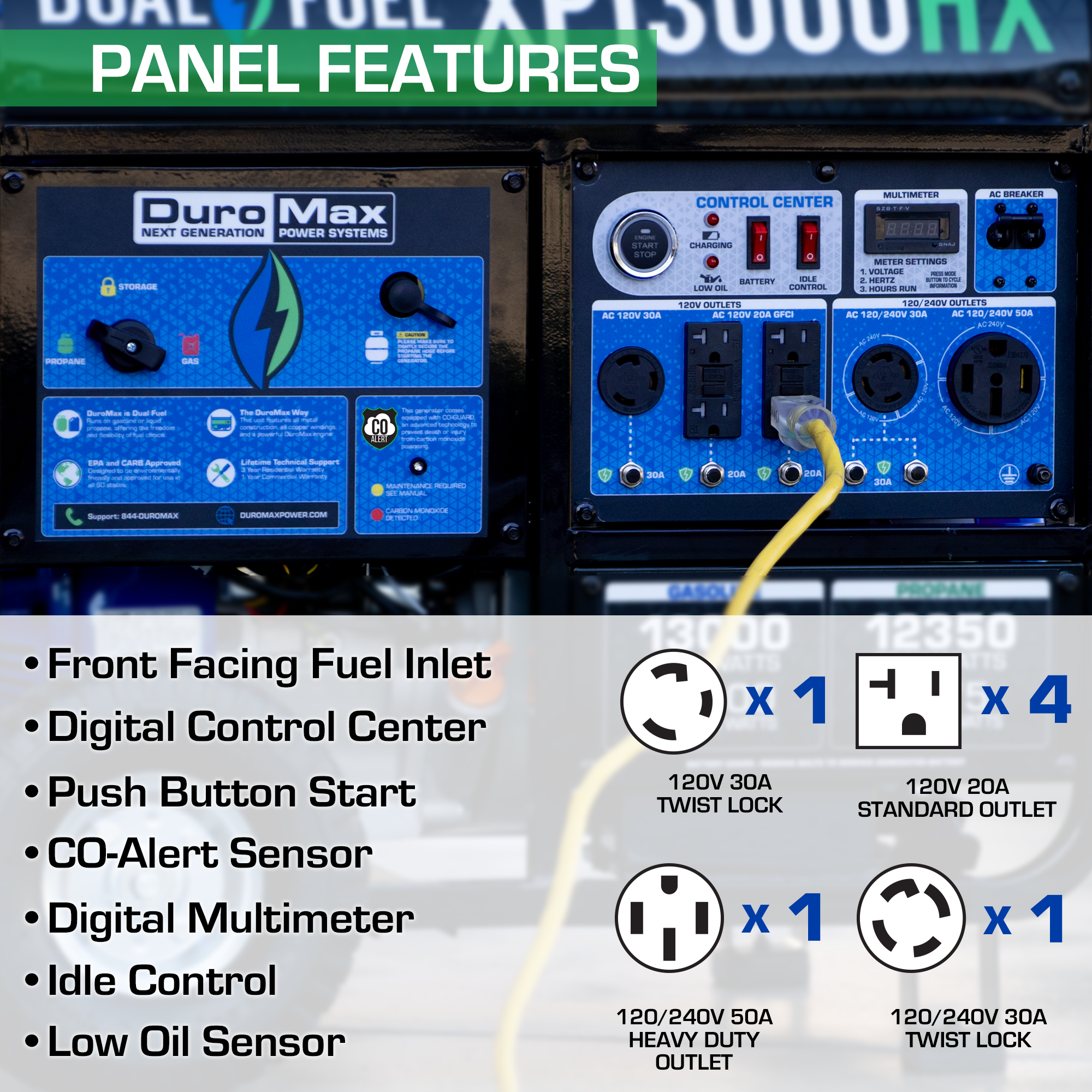 The fully loaded power panel includes four 120V GFCI household outlets, one 120V 30AMP outlet, one 120/240V 30AMP twist-lock outlet, and a heavy-duty 120/240V 50AMP outlet making it transfer switch ready!